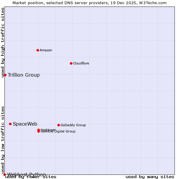TechnologiesContent ManagementServer-side Languages Client-side Languages JavaScript Libraries CSS Frameworks Web Servers Web Panels Operating Systems Web Hosting Data Centers Reverse Proxies DNS Servers Email Servers SSL Certificate Authorities Content Delivery Traffic Analysis Tools Advertising Networks Tag Managers Social Widgets Site Elements Structured Data Markup Languages Character Encodings Image File Formats Top Level Domains Server Locations Content Languages | Technologies > DNS Servers > Technology usage comparison Comparison of the usage statistics of SpaceWeb vs. Trillion Group vs. Webhost Python for websitesThis report shows the usage statistics of SpaceWeb vs. Trillion Group vs. Webhost Python as DNS server provider on the web. See technologies overview for explanations on the methodologies used in the surveys. Our reports are updated daily. UsageThis diagram shows the percentages of websites using the selected technologies. How to read the diagram: