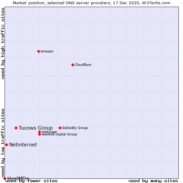 TechnologiesContent ManagementServer-side Languages Client-side Languages JavaScript Libraries CSS Frameworks Web Servers Web Panels Operating Systems Web Hosting Data Centers Reverse Proxies DNS Servers Email Servers SSL Certificate Authorities Content Delivery Traffic Analysis Tools Advertising Networks Tag Managers Social Widgets Site Elements Structured Data Markup Languages Character Encodings Image File Formats Top Level Domains Server Locations Content Languages | Technologies > DNS Servers > Technology usage comparison Comparison of the usage statistics of Tucows Group vs. Netinternet vs. HostMDs for websitesThis report shows the usage statistics of Tucows Group vs. Netinternet vs. HostMDs as DNS server provider on the web. See technologies overview for explanations on the methodologies used in the surveys. Our reports are updated daily. UsageThis diagram shows the percentages of websites using the selected technologies. How to read the diagram: