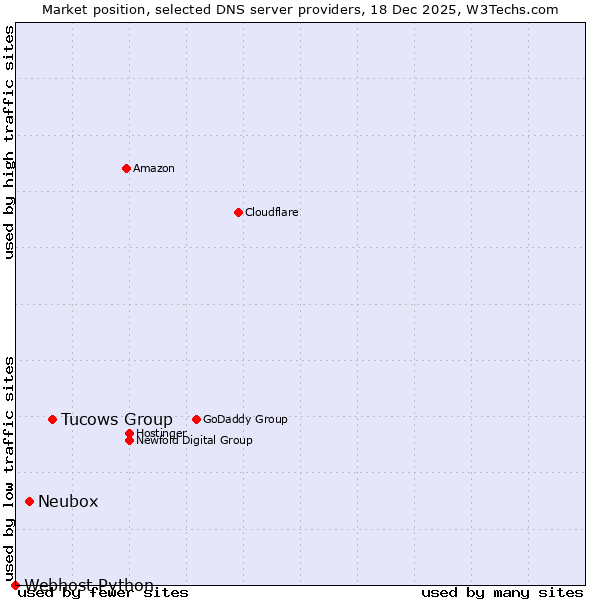 TechnologiesContent ManagementServer-side Languages Client-side Languages JavaScript Libraries CSS Frameworks Web Servers Web Panels Operating Systems Web Hosting Data Centers Reverse Proxies DNS Servers Email Servers SSL Certificate Authorities Content Delivery Traffic Analysis Tools Advertising Networks Tag Managers Social Widgets Site Elements Structured Data Markup Languages Character Encodings Image File Formats Top Level Domains Server Locations Content Languages | Technologies > DNS Servers > Technology usage comparison Comparison of the usage statistics of Tucows Group vs. Neubox vs. Webhost Python for websitesThis report shows the usage statistics of Tucows Group vs. Neubox vs. Webhost Python as DNS server provider on the web. See technologies overview for explanations on the methodologies used in the surveys. Our reports are updated daily. UsageThis diagram shows the percentages of websites using the selected technologies. How to read the diagram: