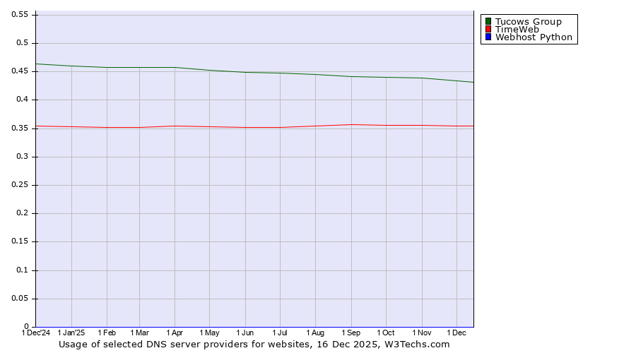 TechnologiesContent ManagementServer-side Languages Client-side Languages JavaScript Libraries CSS Frameworks Web Servers Web Panels Operating Systems Web Hosting Data Centers Reverse Proxies DNS Servers Email Servers SSL Certificate Authorities Content Delivery Traffic Analysis Tools Advertising Networks Tag Managers Social Widgets Site Elements Structured Data Markup Languages Character Encodings Image File Formats Top Level Domains Server Locations Content Languages | Technologies > DNS Servers > Technology usage comparison Comparison of the usage statistics of Tucows Group vs. TimeWeb vs. Webhost Python for websitesThis report shows the usage statistics of Tucows Group vs. TimeWeb vs. Webhost Python as DNS server provider on the web. See technologies overview for explanations on the methodologies used in the surveys. Our reports are updated daily. UsageThis diagram shows the percentages of websites using the selected technologies. How to read the diagram: