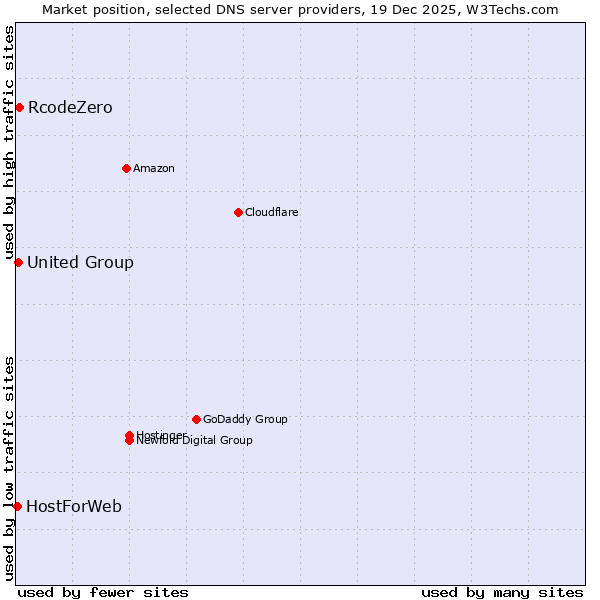TechnologiesContent ManagementServer-side Languages Client-side Languages JavaScript Libraries CSS Frameworks Web Servers Web Panels Operating Systems Web Hosting Data Centers Reverse Proxies DNS Servers Email Servers SSL Certificate Authorities Content Delivery Traffic Analysis Tools Advertising Networks Tag Managers Social Widgets Site Elements Structured Data Markup Languages Character Encodings Image File Formats Top Level Domains Server Locations Content Languages | Technologies > DNS Servers > Technology usage comparison Comparison of the usage statistics of RcodeZero vs. United Group vs. HostForWeb for websitesThis report shows the usage statistics of RcodeZero vs. United Group vs. HostForWeb as DNS server provider on the web. See technologies overview for explanations on the methodologies used in the surveys. Our reports are updated daily. UsageThis diagram shows the percentages of websites using the selected technologies. How to read the diagram:
