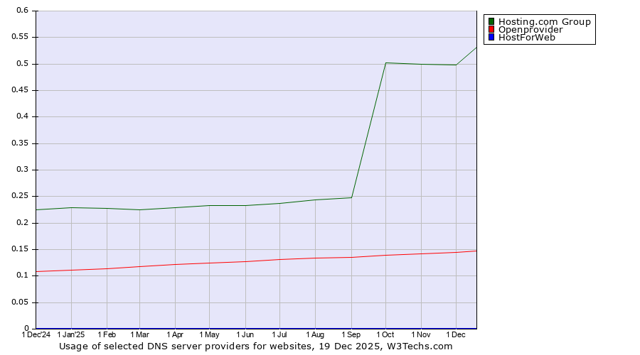 TechnologiesContent ManagementServer-side Languages Client-side Languages JavaScript Libraries CSS Frameworks Web Servers Web Panels Operating Systems Web Hosting Data Centers Reverse Proxies DNS Servers Email Servers SSL Certificate Authorities Content Delivery Traffic Analysis Tools Advertising Networks Tag Managers Social Widgets Site Elements Structured Data Markup Languages Character Encodings Image File Formats Top Level Domains Server Locations Content Languages | Technologies > DNS Servers > Technology usage comparison Comparison of the usage statistics of Hosting.com Group vs. Openprovider vs. HostForWeb for websitesThis report shows the usage statistics of Hosting.com Group vs. Openprovider vs. HostForWeb as DNS server provider on the web. See technologies overview for explanations on the methodologies used in the surveys. Our reports are updated daily. UsageThis diagram shows the percentages of websites using the selected technologies. How to read the diagram: