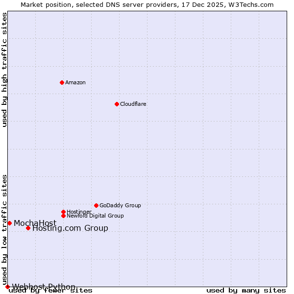 TechnologiesContent ManagementServer-side Languages Client-side Languages JavaScript Libraries CSS Frameworks Web Servers Web Panels Operating Systems Web Hosting Data Centers Reverse Proxies DNS Servers Email Servers SSL Certificate Authorities Content Delivery Traffic Analysis Tools Advertising Networks Tag Managers Social Widgets Site Elements Structured Data Markup Languages Character Encodings Image File Formats Top Level Domains Server Locations Content Languages | Technologies > DNS Servers > Technology usage comparison Comparison of the usage statistics of Hosting.com Group vs. MochaHost vs. Webhost Python for websitesThis report shows the usage statistics of Hosting.com Group vs. MochaHost vs. Webhost Python as DNS server provider on the web. See technologies overview for explanations on the methodologies used in the surveys. Our reports are updated daily. UsageThis diagram shows the percentages of websites using the selected technologies. How to read the diagram: