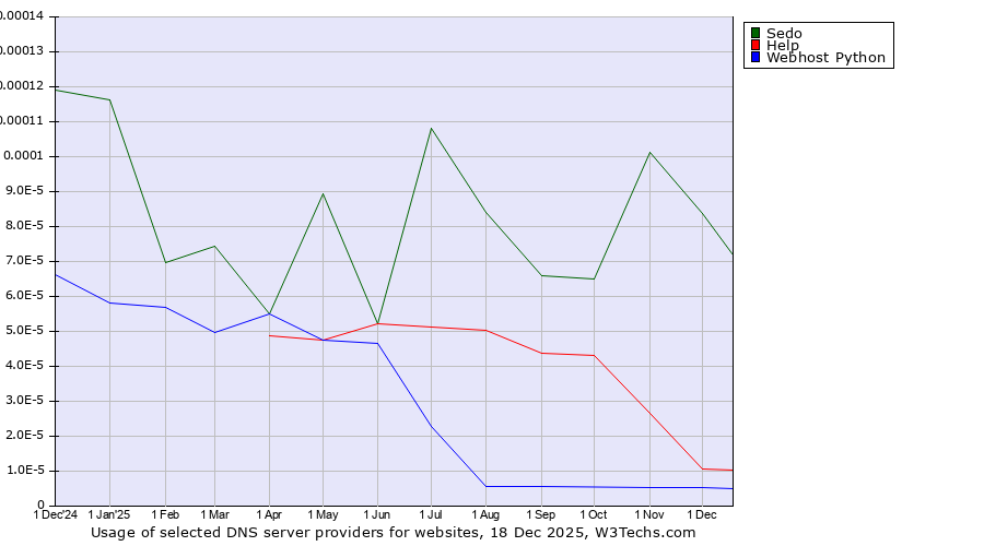 TechnologiesContent ManagementServer-side Languages Client-side Languages JavaScript Libraries CSS Frameworks Web Servers Web Panels Operating Systems Web Hosting Data Centers Reverse Proxies DNS Servers Email Servers SSL Certificate Authorities Content Delivery Traffic Analysis Tools Advertising Networks Tag Managers Social Widgets Site Elements Structured Data Markup Languages Character Encodings Image File Formats Top Level Domains Server Locations Content Languages | Technologies > DNS Servers > Technology usage comparison Comparison of the usage statistics of Sedo vs. Help vs. Webhost Python for websitesThis report shows the usage statistics of Sedo vs. Help vs. Webhost Python as DNS server provider on the web. See technologies overview for explanations on the methodologies used in the surveys. Our reports are updated daily. UsageThis diagram shows the percentages of websites using the selected technologies. How to read the diagram: