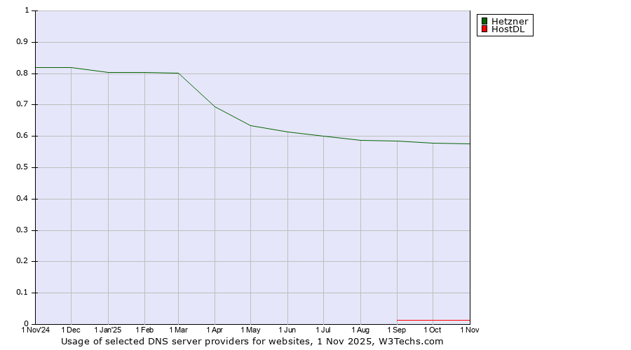 TechnologiesContent ManagementServer-side Languages Client-side Languages JavaScript Libraries CSS Frameworks Web Servers Web Panels Operating Systems Web Hosting Data Centers Reverse Proxies DNS Servers Email Servers SSL Certificate Authorities Content Delivery Traffic Analysis Tools Advertising Networks Tag Managers Social Widgets Site Elements Structured Data Markup Languages Character Encodings Image File Formats Top Level Domains Server Locations Content Languages ComparisonCompare with other | Technologies > DNS Servers > Technology usage comparison Comparison of the usage statistics of Hetzner vs. HostDL for websitesThis report shows the usage statistics of Hetzner vs. HostDL as DNS server provider on the web. See technologies overview for explanations on the methodologies used in the surveys. Our reports are updated daily. UsageThis diagram shows the percentages of websites using the selected technologies. How to read the diagram:
