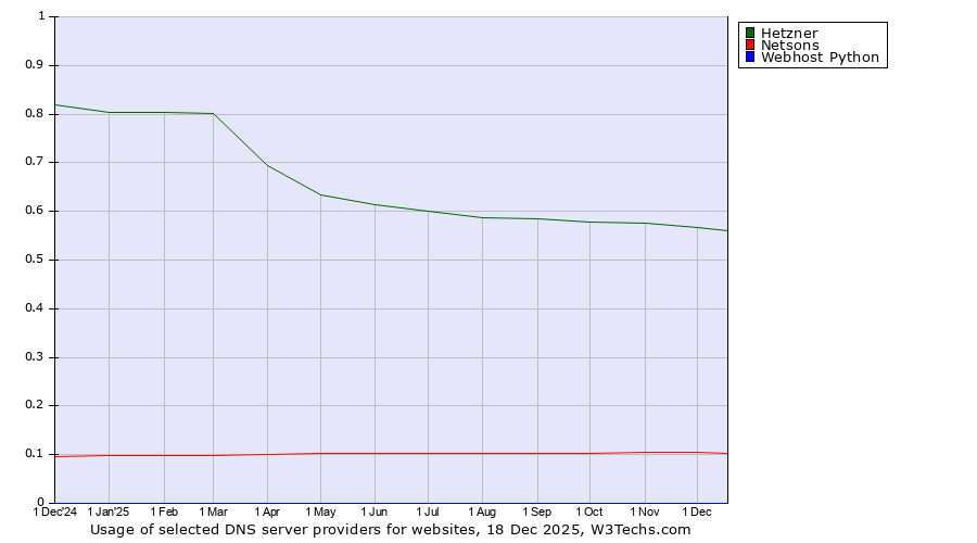 TechnologiesContent ManagementServer-side Languages Client-side Languages JavaScript Libraries CSS Frameworks Web Servers Web Panels Operating Systems Web Hosting Data Centers Reverse Proxies DNS Servers Email Servers SSL Certificate Authorities Content Delivery Traffic Analysis Tools Advertising Networks Tag Managers Social Widgets Site Elements Structured Data Markup Languages Character Encodings Image File Formats Top Level Domains Server Locations Content Languages | Technologies > DNS Servers > Technology usage comparison Comparison of the usage statistics of Hetzner vs. Netsons vs. Webhost Python for websitesThis report shows the usage statistics of Hetzner vs. Netsons vs. Webhost Python as DNS server provider on the web. See technologies overview for explanations on the methodologies used in the surveys. Our reports are updated daily. UsageThis diagram shows the percentages of websites using the selected technologies. How to read the diagram:
