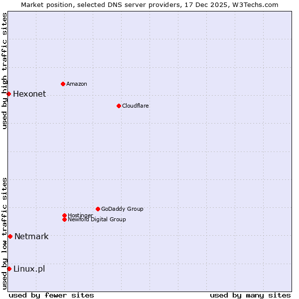 TechnologiesContent ManagementServer-side Languages Client-side Languages JavaScript Libraries CSS Frameworks Web Servers Web Panels Operating Systems Web Hosting Data Centers Reverse Proxies DNS Servers Email Servers SSL Certificate Authorities Content Delivery Traffic Analysis Tools Advertising Networks Tag Managers Social Widgets Site Elements Structured Data Markup Languages Character Encodings Image File Formats Top Level Domains Server Locations Content Languages | Technologies > DNS Servers > Technology usage comparison Comparison of the usage statistics of Netmark vs. Linux.pl vs. Hexonet for websitesThis report shows the usage statistics of Netmark vs. Linux.pl vs. Hexonet as DNS server provider on the web. See technologies overview for explanations on the methodologies used in the surveys. Our reports are updated daily. UsageThis diagram shows the percentages of websites using the selected technologies. How to read the diagram: