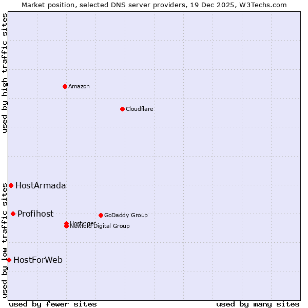 TechnologiesContent ManagementServer-side Languages Client-side Languages JavaScript Libraries CSS Frameworks Web Servers Web Panels Operating Systems Web Hosting Data Centers Reverse Proxies DNS Servers Email Servers SSL Certificate Authorities Content Delivery Traffic Analysis Tools Advertising Networks Tag Managers Social Widgets Site Elements Structured Data Markup Languages Character Encodings Image File Formats Top Level Domains Server Locations Content Languages | Technologies > DNS Servers > Technology usage comparison Comparison of the usage statistics of Profihost vs. HostArmada vs. HostForWeb for websitesThis report shows the usage statistics of Profihost vs. HostArmada vs. HostForWeb as DNS server provider on the web. See technologies overview for explanations on the methodologies used in the surveys. Our reports are updated daily. UsageThis diagram shows the percentages of websites using the selected technologies. How to read the diagram: