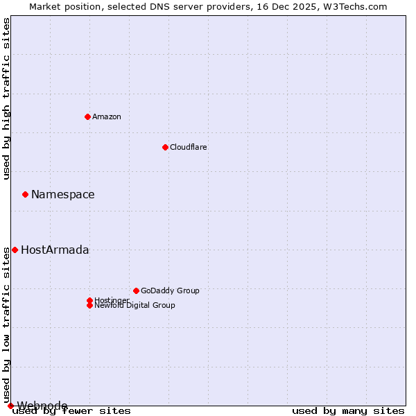 TechnologiesContent ManagementServer-side Languages Client-side Languages JavaScript Libraries CSS Frameworks Web Servers Web Panels Operating Systems Web Hosting Data Centers Reverse Proxies DNS Servers Email Servers SSL Certificate Authorities Content Delivery Traffic Analysis Tools Advertising Networks Tag Managers Social Widgets Site Elements Structured Data Markup Languages Character Encodings Image File Formats Top Level Domains Server Locations Content Languages | Technologies > DNS Servers > Technology usage comparison Comparison of the usage statistics of Namespace vs. HostArmada vs. Webnode for websitesThis report shows the usage statistics of Namespace vs. HostArmada vs. Webnode as DNS server provider on the web. See technologies overview for explanations on the methodologies used in the surveys. Our reports are updated daily. UsageThis diagram shows the percentages of websites using the selected technologies. How to read the diagram: