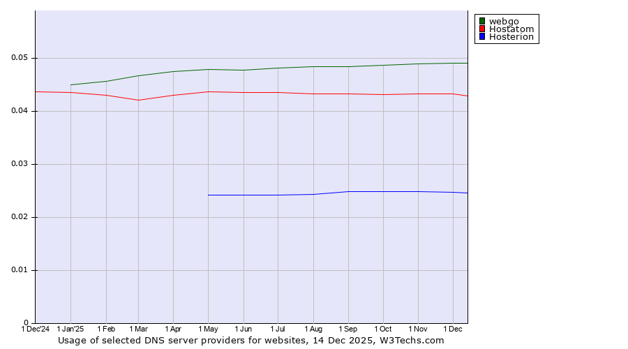 TechnologiesContent ManagementServer-side Languages Client-side Languages JavaScript Libraries CSS Frameworks Web Servers Web Panels Operating Systems Web Hosting Data Centers Reverse Proxies DNS Servers Email Servers SSL Certificate Authorities Content Delivery Traffic Analysis Tools Advertising Networks Tag Managers Social Widgets Site Elements Structured Data Markup Languages Character Encodings Image File Formats Top Level Domains Server Locations Content Languages | Technologies > DNS Servers > Technology usage comparison Comparison of the usage statistics of webgo vs. Hostatom vs. Hosterion for websitesThis report shows the usage statistics of webgo vs. Hostatom vs. Hosterion as DNS server provider on the web. See technologies overview for explanations on the methodologies used in the surveys. Our reports are updated daily. UsageThis diagram shows the percentages of websites using the selected technologies. How to read the diagram: