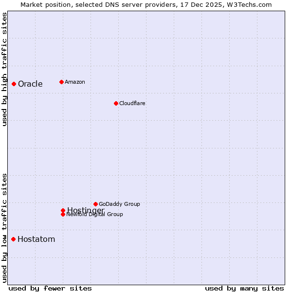 TechnologiesContent ManagementServer-side Languages Client-side Languages JavaScript Libraries CSS Frameworks Web Servers Web Panels Operating Systems Web Hosting Data Centers Reverse Proxies DNS Servers Email Servers SSL Certificate Authorities Content Delivery Traffic Analysis Tools Advertising Networks Tag Managers Social Widgets Site Elements Structured Data Markup Languages Character Encodings Image File Formats Top Level Domains Server Locations Content Languages | Technologies > DNS Servers > Technology usage comparison Comparison of the usage statistics of Hostinger vs. Oracle vs. Hostatom for websitesThis report shows the usage statistics of Hostinger vs. Oracle vs. Hostatom as DNS server provider on the web. See technologies overview for explanations on the methodologies used in the surveys. Our reports are updated daily. UsageThis diagram shows the percentages of websites using the selected technologies. How to read the diagram: