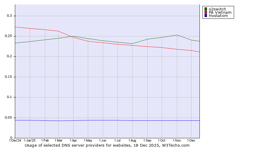 TechnologiesContent ManagementServer-side Languages Client-side Languages JavaScript Libraries CSS Frameworks Web Servers Web Panels Operating Systems Web Hosting Data Centers Reverse Proxies DNS Servers Email Servers SSL Certificate Authorities Content Delivery Traffic Analysis Tools Advertising Networks Tag Managers Social Widgets Site Elements Structured Data Markup Languages Character Encodings Image File Formats Top Level Domains Server Locations Content Languages | Technologies > DNS Servers > Technology usage comparison Comparison of the usage statistics of o2switch vs. PA Vietnam vs. Hostatom for websitesThis report shows the usage statistics of o2switch vs. PA Vietnam vs. Hostatom as DNS server provider on the web. See technologies overview for explanations on the methodologies used in the surveys. Our reports are updated daily. UsageThis diagram shows the percentages of websites using the selected technologies. How to read the diagram: