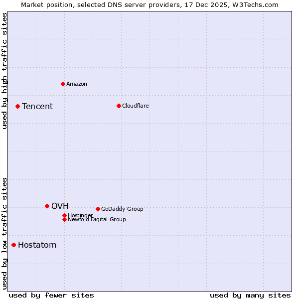 TechnologiesContent ManagementServer-side Languages Client-side Languages JavaScript Libraries CSS Frameworks Web Servers Web Panels Operating Systems Web Hosting Data Centers Reverse Proxies DNS Servers Email Servers SSL Certificate Authorities Content Delivery Traffic Analysis Tools Advertising Networks Tag Managers Social Widgets Site Elements Structured Data Markup Languages Character Encodings Image File Formats Top Level Domains Server Locations Content Languages | Technologies > DNS Servers > Technology usage comparison Comparison of the usage statistics of OVH vs. Tencent vs. Hostatom for websitesThis report shows the usage statistics of OVH vs. Tencent vs. Hostatom as DNS server provider on the web. See technologies overview for explanations on the methodologies used in the surveys. Our reports are updated daily. UsageThis diagram shows the percentages of websites using the selected technologies. How to read the diagram: