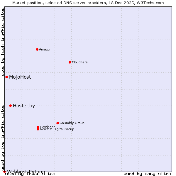 TechnologiesContent ManagementServer-side Languages Client-side Languages JavaScript Libraries CSS Frameworks Web Servers Web Panels Operating Systems Web Hosting Data Centers Reverse Proxies DNS Servers Email Servers SSL Certificate Authorities Content Delivery Traffic Analysis Tools Advertising Networks Tag Managers Social Widgets Site Elements Structured Data Markup Languages Character Encodings Image File Formats Top Level Domains Server Locations Content Languages | Technologies > DNS Servers > Technology usage comparison Comparison of the usage statistics of Hoster.by vs. MojoHost vs. Webhost Python for websitesThis report shows the usage statistics of Hoster.by vs. MojoHost vs. Webhost Python as DNS server provider on the web. See technologies overview for explanations on the methodologies used in the surveys. Our reports are updated daily. UsageThis diagram shows the percentages of websites using the selected technologies. How to read the diagram: