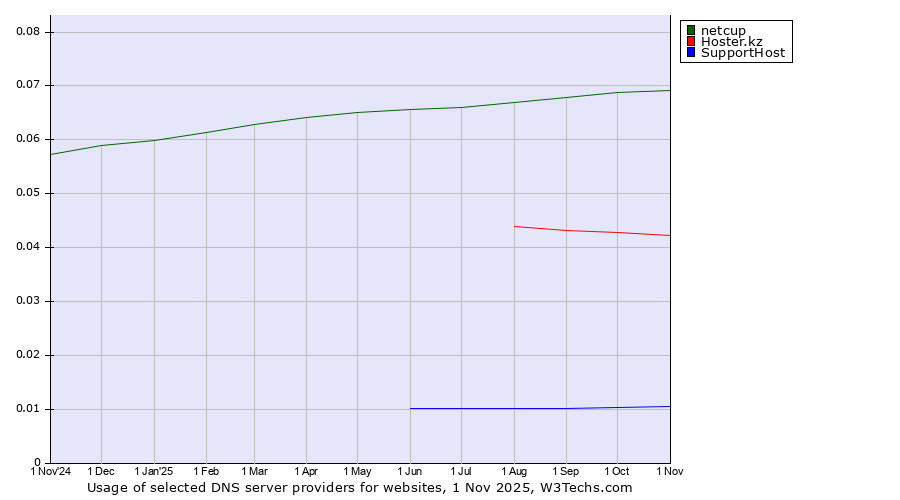 TechnologiesContent ManagementServer-side Languages Client-side Languages JavaScript Libraries CSS Frameworks Web Servers Web Panels Operating Systems Web Hosting Data Centers Reverse Proxies DNS Servers Email Servers SSL Certificate Authorities Content Delivery Traffic Analysis Tools Advertising Networks Tag Managers Social Widgets Site Elements Structured Data Markup Languages Character Encodings Image File Formats Top Level Domains Server Locations Content Languages | Technologies > DNS Servers > Technology usage comparison Comparison of the usage statistics of netcup vs. Hoster.kz vs. SupportHost for websitesThis report shows the usage statistics of netcup vs. Hoster.kz vs. SupportHost as DNS server provider on the web. See technologies overview for explanations on the methodologies used in the surveys. Our reports are updated daily. UsageThis diagram shows the percentages of websites using the selected technologies. How to read the diagram: