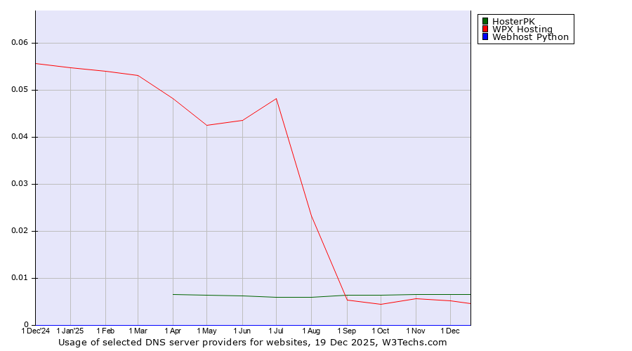 TechnologiesContent ManagementServer-side Languages Client-side Languages JavaScript Libraries CSS Frameworks Web Servers Web Panels Operating Systems Web Hosting Data Centers Reverse Proxies DNS Servers Email Servers SSL Certificate Authorities Content Delivery Traffic Analysis Tools Advertising Networks Tag Managers Social Widgets Site Elements Structured Data Markup Languages Character Encodings Image File Formats Top Level Domains Server Locations Content Languages | Technologies > DNS Servers > Technology usage comparison Comparison of the usage statistics of HosterPK vs. WPX Hosting vs. Webhost Python for websitesThis report shows the usage statistics of HosterPK vs. WPX Hosting vs. Webhost Python as DNS server provider on the web. See technologies overview for explanations on the methodologies used in the surveys. Our reports are updated daily. UsageThis diagram shows the percentages of websites using the selected technologies. How to read the diagram: