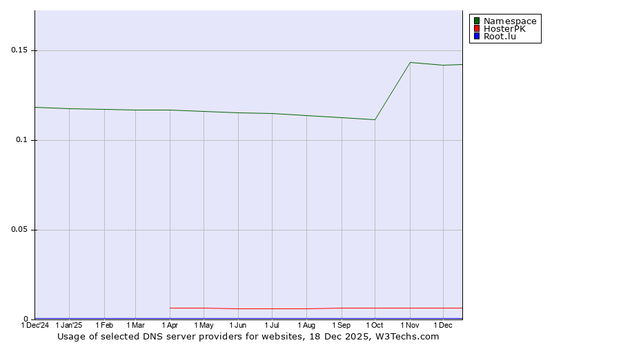 TechnologiesContent ManagementServer-side Languages Client-side Languages JavaScript Libraries CSS Frameworks Web Servers Web Panels Operating Systems Web Hosting Data Centers Reverse Proxies DNS Servers Email Servers SSL Certificate Authorities Content Delivery Traffic Analysis Tools Advertising Networks Tag Managers Social Widgets Site Elements Structured Data Markup Languages Character Encodings Image File Formats Top Level Domains Server Locations Content Languages | Technologies > DNS Servers > Technology usage comparison Comparison of the usage statistics of Namespace vs. HosterPK vs. Root.lu for websitesThis report shows the usage statistics of Namespace vs. HosterPK vs. Root.lu as DNS server provider on the web. See technologies overview for explanations on the methodologies used in the surveys. Our reports are updated daily. UsageThis diagram shows the percentages of websites using the selected technologies. How to read the diagram: