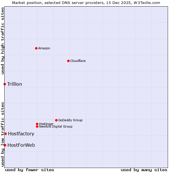 TechnologiesContent ManagementServer-side Languages Client-side Languages JavaScript Libraries CSS Frameworks Web Servers Web Panels Operating Systems Web Hosting Data Centers Reverse Proxies DNS Servers Email Servers SSL Certificate Authorities Content Delivery Traffic Analysis Tools Advertising Networks Tag Managers Social Widgets Site Elements Structured Data Markup Languages Character Encodings Image File Formats Top Level Domains Server Locations Content Languages | Technologies > DNS Servers > Technology usage comparison Comparison of the usage statistics of Hostfactory vs. HostForWeb vs. Trillion for websitesThis report shows the usage statistics of Hostfactory vs. HostForWeb vs. Trillion as DNS server provider on the web. See technologies overview for explanations on the methodologies used in the surveys. Our reports are updated daily. UsageThis diagram shows the percentages of websites using the selected technologies. How to read the diagram: