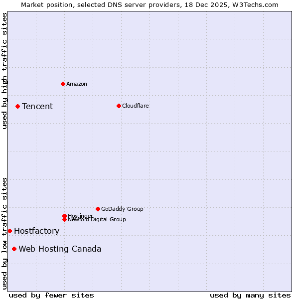 TechnologiesContent ManagementServer-side Languages Client-side Languages JavaScript Libraries CSS Frameworks Web Servers Web Panels Operating Systems Web Hosting Data Centers Reverse Proxies DNS Servers Email Servers SSL Certificate Authorities Content Delivery Traffic Analysis Tools Advertising Networks Tag Managers Social Widgets Site Elements Structured Data Markup Languages Character Encodings Image File Formats Top Level Domains Server Locations Content Languages | Technologies > DNS Servers > Technology usage comparison Comparison of the usage statistics of Tencent vs. Web Hosting Canada vs. Hostfactory for websitesThis report shows the usage statistics of Tencent vs. Web Hosting Canada vs. Hostfactory as DNS server provider on the web. See technologies overview for explanations on the methodologies used in the surveys. Our reports are updated daily. UsageThis diagram shows the percentages of websites using the selected technologies. How to read the diagram: