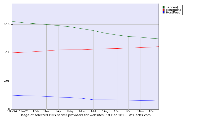 TechnologiesContent ManagementServer-side Languages Client-side Languages JavaScript Libraries CSS Frameworks Web Servers Web Panels Operating Systems Web Hosting Data Centers Reverse Proxies DNS Servers Email Servers SSL Certificate Authorities Content Delivery Traffic Analysis Tools Advertising Networks Tag Managers Social Widgets Site Elements Structured Data Markup Languages Character Encodings Image File Formats Top Level Domains Server Locations Content Languages | Technologies > DNS Servers > Technology usage comparison Comparison of the usage statistics of Tencent vs. Hostpoint vs. HostFeat for websitesThis report shows the usage statistics of Tencent vs. Hostpoint vs. HostFeat as DNS server provider on the web. See technologies overview for explanations on the methodologies used in the surveys. Our reports are updated daily. UsageThis diagram shows the percentages of websites using the selected technologies. How to read the diagram: