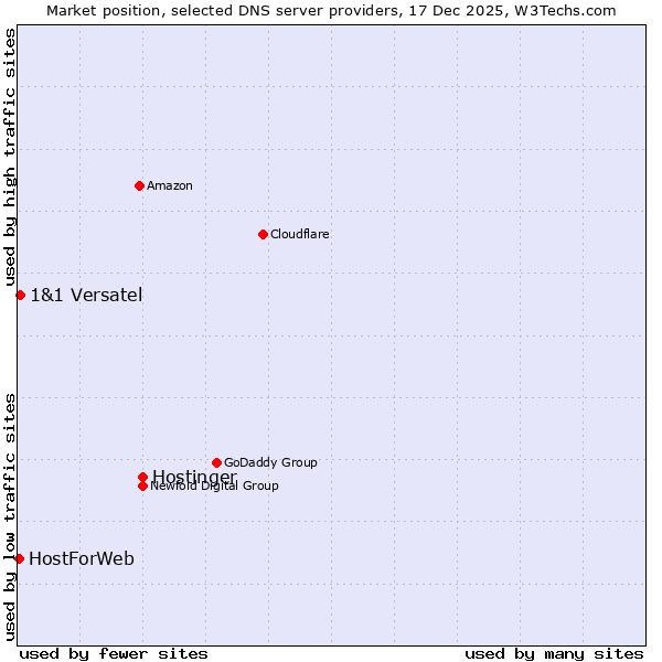 TechnologiesContent ManagementServer-side Languages Client-side Languages JavaScript Libraries CSS Frameworks Web Servers Web Panels Operating Systems Web Hosting Data Centers Reverse Proxies DNS Servers Email Servers SSL Certificate Authorities Content Delivery Traffic Analysis Tools Advertising Networks Tag Managers Social Widgets Site Elements Structured Data Markup Languages Character Encodings Image File Formats Top Level Domains Server Locations Content Languages | Technologies > DNS Servers > Technology usage comparison Comparison of the usage statistics of Hostinger vs. 1&1 Versatel vs. HostForWeb for websitesThis report shows the usage statistics of Hostinger vs. 1&1 Versatel vs. HostForWeb as DNS server provider on the web. See technologies overview for explanations on the methodologies used in the surveys. Our reports are updated daily. UsageThis diagram shows the percentages of websites using the selected technologies. How to read the diagram: