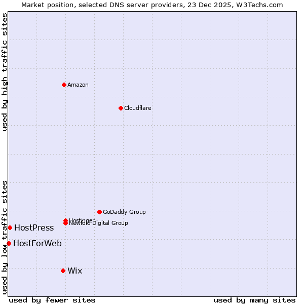 TechnologiesContent ManagementServer-side Languages Client-side Languages JavaScript Libraries CSS Frameworks Web Servers Web Panels Operating Systems Web Hosting Data Centers Reverse Proxies DNS Servers Email Servers SSL Certificate Authorities Content Delivery Traffic Analysis Tools Advertising Networks Tag Managers Social Widgets Site Elements Structured Data Markup Languages Character Encodings Image File Formats Top Level Domains Server Locations Content Languages | Technologies > DNS Servers > Technology usage comparison Comparison of the usage statistics of Wix vs. HostPress vs. HostForWeb for websitesThis report shows the usage statistics of Wix vs. HostPress vs. HostForWeb as DNS server provider on the web. See technologies overview for explanations on the methodologies used in the surveys. Our reports are updated daily. UsageThis diagram shows the percentages of websites using the selected technologies. How to read the diagram: