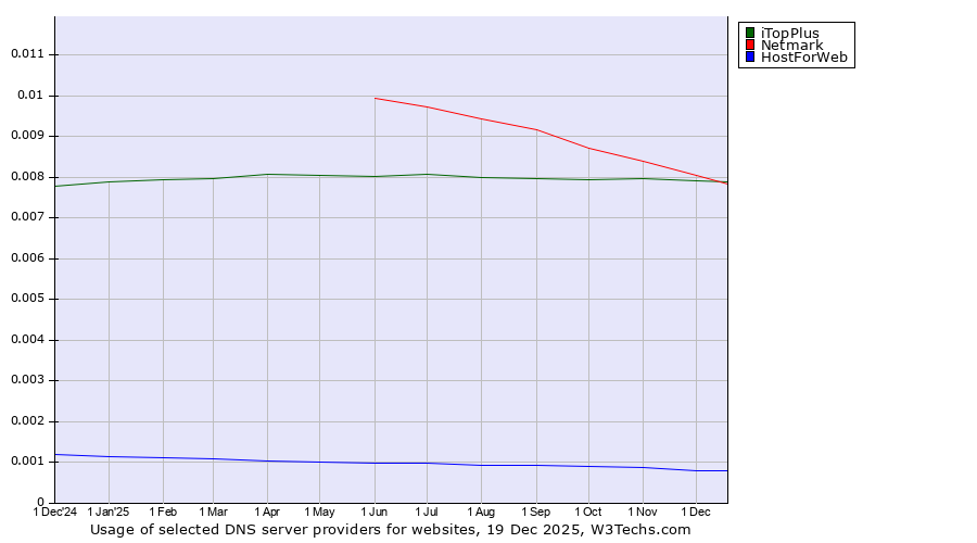 TechnologiesContent ManagementServer-side Languages Client-side Languages JavaScript Libraries CSS Frameworks Web Servers Web Panels Operating Systems Web Hosting Data Centers Reverse Proxies DNS Servers Email Servers SSL Certificate Authorities Content Delivery Traffic Analysis Tools Advertising Networks Tag Managers Social Widgets Site Elements Structured Data Markup Languages Character Encodings Image File Formats Top Level Domains Server Locations Content Languages | Technologies > DNS Servers > Technology usage comparison Comparison of the usage statistics of iTopPlus vs. Netmark vs. HostForWeb for websitesThis report shows the usage statistics of iTopPlus vs. Netmark vs. HostForWeb as DNS server provider on the web. See technologies overview for explanations on the methodologies used in the surveys. Our reports are updated daily. UsageThis diagram shows the percentages of websites using the selected technologies. How to read the diagram: