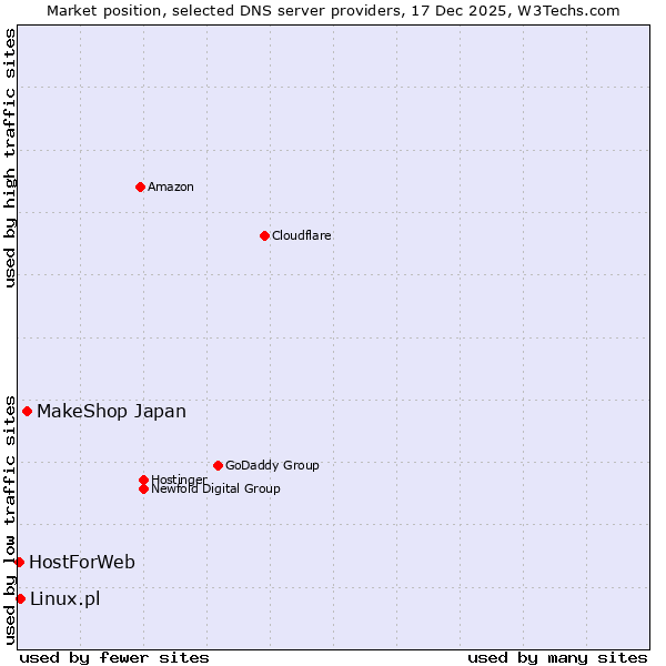 TechnologiesContent ManagementServer-side Languages Client-side Languages JavaScript Libraries CSS Frameworks Web Servers Web Panels Operating Systems Web Hosting Data Centers Reverse Proxies DNS Servers Email Servers SSL Certificate Authorities Content Delivery Traffic Analysis Tools Advertising Networks Tag Managers Social Widgets Site Elements Structured Data Markup Languages Character Encodings Image File Formats Top Level Domains Server Locations Content Languages | Technologies > DNS Servers > Technology usage comparison Comparison of the usage statistics of MakeShop Japan vs. Linux.pl vs. HostForWeb for websitesThis report shows the usage statistics of MakeShop Japan vs. Linux.pl vs. HostForWeb as DNS server provider on the web. See technologies overview for explanations on the methodologies used in the surveys. Our reports are updated daily. UsageThis diagram shows the percentages of websites using the selected technologies. How to read the diagram: