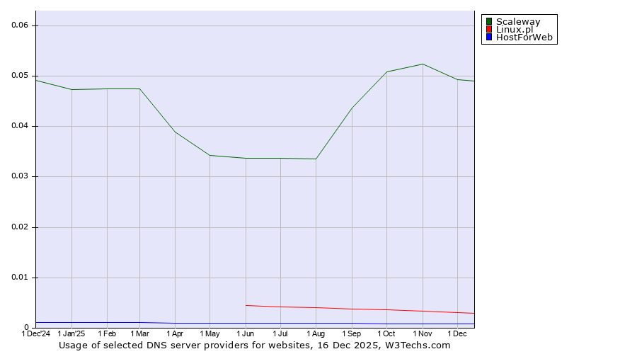 TechnologiesContent ManagementServer-side Languages Client-side Languages JavaScript Libraries CSS Frameworks Web Servers Web Panels Operating Systems Web Hosting Data Centers Reverse Proxies DNS Servers Email Servers SSL Certificate Authorities Content Delivery Traffic Analysis Tools Advertising Networks Tag Managers Social Widgets Site Elements Structured Data Markup Languages Character Encodings Image File Formats Top Level Domains Server Locations Content Languages | Technologies > DNS Servers > Technology usage comparison Comparison of the usage statistics of Scaleway vs. Linux.pl vs. HostForWeb for websitesThis report shows the usage statistics of Scaleway vs. Linux.pl vs. HostForWeb as DNS server provider on the web. See technologies overview for explanations on the methodologies used in the surveys. Our reports are updated daily. UsageThis diagram shows the percentages of websites using the selected technologies. How to read the diagram: