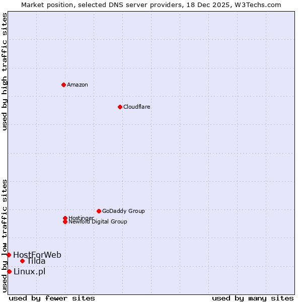 TechnologiesContent ManagementServer-side Languages Client-side Languages JavaScript Libraries CSS Frameworks Web Servers Web Panels Operating Systems Web Hosting Data Centers Reverse Proxies DNS Servers Email Servers SSL Certificate Authorities Content Delivery Traffic Analysis Tools Advertising Networks Tag Managers Social Widgets Site Elements Structured Data Markup Languages Character Encodings Image File Formats Top Level Domains Server Locations Content Languages | Technologies > DNS Servers > Technology usage comparison Comparison of the usage statistics of Tilda vs. Linux.pl vs. HostForWeb for websitesThis report shows the usage statistics of Tilda vs. Linux.pl vs. HostForWeb as DNS server provider on the web. See technologies overview for explanations on the methodologies used in the surveys. Our reports are updated daily. UsageThis diagram shows the percentages of websites using the selected technologies. How to read the diagram: