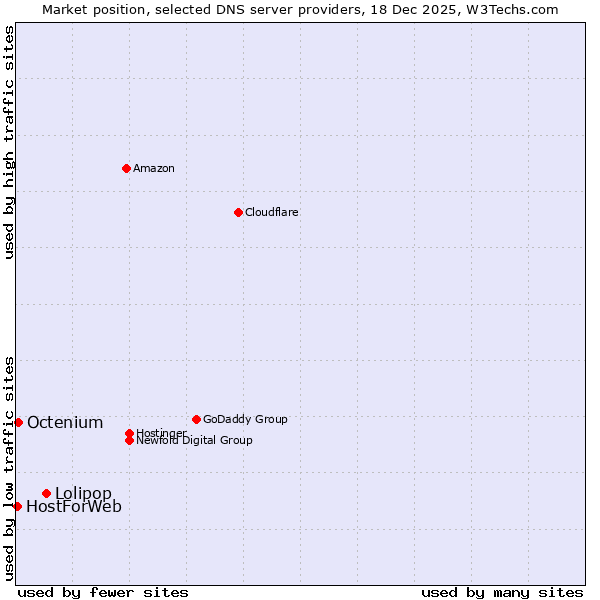 TechnologiesContent ManagementServer-side Languages Client-side Languages JavaScript Libraries CSS Frameworks Web Servers Web Panels Operating Systems Web Hosting Data Centers Reverse Proxies DNS Servers Email Servers SSL Certificate Authorities Content Delivery Traffic Analysis Tools Advertising Networks Tag Managers Social Widgets Site Elements Structured Data Markup Languages Character Encodings Image File Formats Top Level Domains Server Locations Content Languages | Technologies > DNS Servers > Technology usage comparison Comparison of the usage statistics of Lolipop vs. Octenium vs. HostForWeb for websitesThis report shows the usage statistics of Lolipop vs. Octenium vs. HostForWeb as DNS server provider on the web. See technologies overview for explanations on the methodologies used in the surveys. Our reports are updated daily. UsageThis diagram shows the percentages of websites using the selected technologies. How to read the diagram: