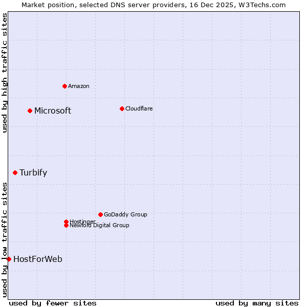 TechnologiesContent ManagementServer-side Languages Client-side Languages JavaScript Libraries CSS Frameworks Web Servers Web Panels Operating Systems Web Hosting Data Centers Reverse Proxies DNS Servers Email Servers SSL Certificate Authorities Content Delivery Traffic Analysis Tools Advertising Networks Tag Managers Social Widgets Site Elements Structured Data Markup Languages Character Encodings Image File Formats Top Level Domains Server Locations Content Languages | Technologies > DNS Servers > Technology usage comparison Comparison of the usage statistics of Microsoft vs. Turbify vs. HostForWeb for websitesThis report shows the usage statistics of Microsoft vs. Turbify vs. HostForWeb as DNS server provider on the web. See technologies overview for explanations on the methodologies used in the surveys. Our reports are updated daily. UsageThis diagram shows the percentages of websites using the selected technologies. How to read the diagram:
