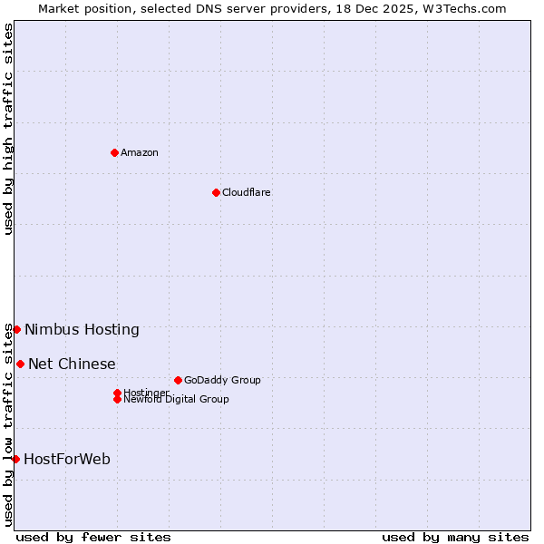 TechnologiesContent ManagementServer-side Languages Client-side Languages JavaScript Libraries CSS Frameworks Web Servers Web Panels Operating Systems Web Hosting Data Centers Reverse Proxies DNS Servers Email Servers SSL Certificate Authorities Content Delivery Traffic Analysis Tools Advertising Networks Tag Managers Social Widgets Site Elements Structured Data Markup Languages Character Encodings Image File Formats Top Level Domains Server Locations Content Languages | Technologies > DNS Servers > Technology usage comparison Comparison of the usage statistics of Net Chinese vs. Nimbus Hosting vs. HostForWeb for websitesThis report shows the usage statistics of Net Chinese vs. Nimbus Hosting vs. HostForWeb as DNS server provider on the web. See technologies overview for explanations on the methodologies used in the surveys. Our reports are updated daily. UsageThis diagram shows the percentages of websites using the selected technologies. How to read the diagram: