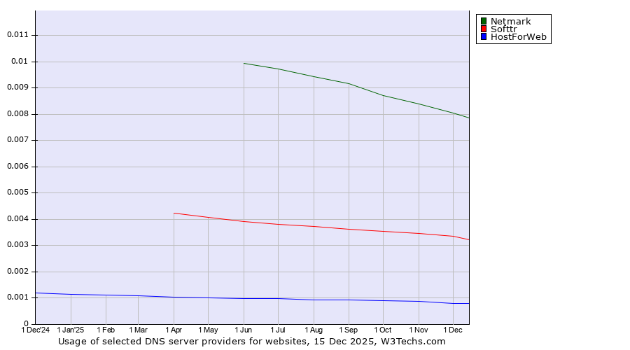 TechnologiesContent ManagementServer-side Languages Client-side Languages JavaScript Libraries CSS Frameworks Web Servers Web Panels Operating Systems Web Hosting Data Centers Reverse Proxies DNS Servers Email Servers SSL Certificate Authorities Content Delivery Traffic Analysis Tools Advertising Networks Tag Managers Social Widgets Site Elements Structured Data Markup Languages Character Encodings Image File Formats Top Level Domains Server Locations Content Languages | Technologies > DNS Servers > Technology usage comparison Comparison of the usage statistics of Netmark vs. Softtr vs. HostForWeb for websitesThis report shows the usage statistics of Netmark vs. Softtr vs. HostForWeb as DNS server provider on the web. See technologies overview for explanations on the methodologies used in the surveys. Our reports are updated daily. UsageThis diagram shows the percentages of websites using the selected technologies. How to read the diagram: