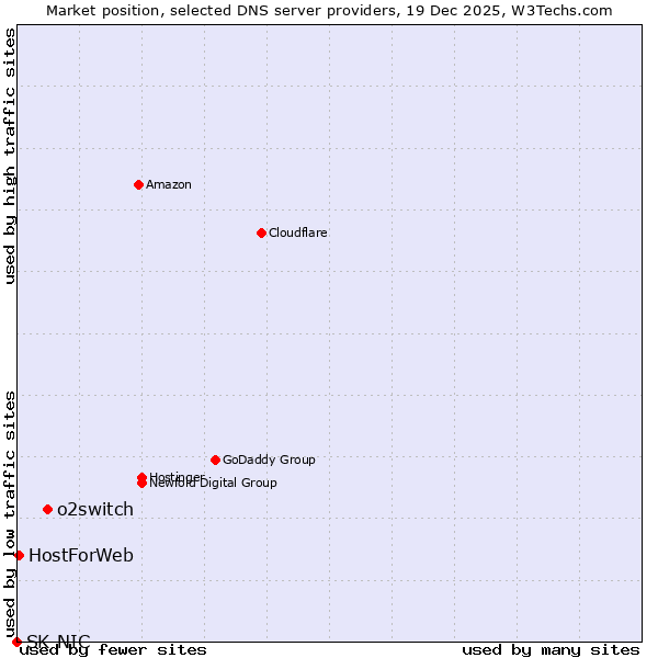 TechnologiesContent ManagementServer-side Languages Client-side Languages JavaScript Libraries CSS Frameworks Web Servers Web Panels Operating Systems Web Hosting Data Centers Reverse Proxies DNS Servers Email Servers SSL Certificate Authorities Content Delivery Traffic Analysis Tools Advertising Networks Tag Managers Social Widgets Site Elements Structured Data Markup Languages Character Encodings Image File Formats Top Level Domains Server Locations Content Languages | Technologies > DNS Servers > Technology usage comparison Comparison of the usage statistics of o2switch vs. HostForWeb vs. SK-NIC for websitesThis report shows the usage statistics of o2switch vs. HostForWeb vs. SK-NIC as DNS server provider on the web. See technologies overview for explanations on the methodologies used in the surveys. Our reports are updated daily. UsageThis diagram shows the percentages of websites using the selected technologies. How to read the diagram: