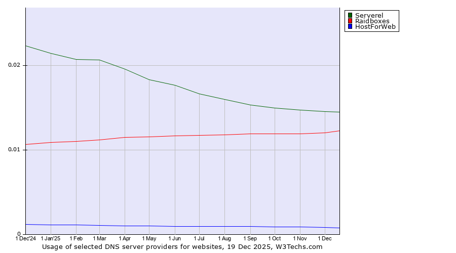 TechnologiesContent ManagementServer-side Languages Client-side Languages JavaScript Libraries CSS Frameworks Web Servers Web Panels Operating Systems Web Hosting Data Centers Reverse Proxies DNS Servers Email Servers SSL Certificate Authorities Content Delivery Traffic Analysis Tools Advertising Networks Tag Managers Social Widgets Site Elements Structured Data Markup Languages Character Encodings Image File Formats Top Level Domains Server Locations Content Languages | Technologies > DNS Servers > Technology usage comparison Comparison of the usage statistics of Serverel vs. Raidboxes vs. HostForWeb for websitesThis report shows the usage statistics of Serverel vs. Raidboxes vs. HostForWeb as DNS server provider on the web. See technologies overview for explanations on the methodologies used in the surveys. Our reports are updated daily. UsageThis diagram shows the percentages of websites using the selected technologies. How to read the diagram: