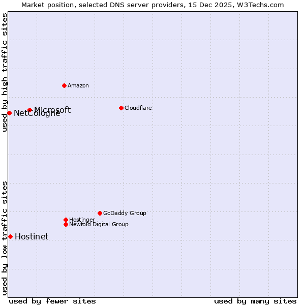 TechnologiesContent ManagementServer-side Languages Client-side Languages JavaScript Libraries CSS Frameworks Web Servers Web Panels Operating Systems Web Hosting Data Centers Reverse Proxies DNS Servers Email Servers SSL Certificate Authorities Content Delivery Traffic Analysis Tools Advertising Networks Tag Managers Social Widgets Site Elements Structured Data Markup Languages Character Encodings Image File Formats Top Level Domains Server Locations Content Languages | Technologies > DNS Servers > Technology usage comparison Comparison of the usage statistics of Microsoft vs. Hostinet vs. NetCologne for websitesThis report shows the usage statistics of Microsoft vs. Hostinet vs. NetCologne as DNS server provider on the web. See technologies overview for explanations on the methodologies used in the surveys. Our reports are updated daily. UsageThis diagram shows the percentages of websites using the selected technologies. How to read the diagram:
