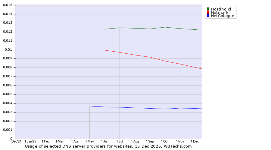 TechnologiesContent ManagementServer-side Languages Client-side Languages JavaScript Libraries CSS Frameworks Web Servers Web Panels Operating Systems Web Hosting Data Centers Reverse Proxies DNS Servers Email Servers SSL Certificate Authorities Content Delivery Traffic Analysis Tools Advertising Networks Tag Managers Social Widgets Site Elements Structured Data Markup Languages Character Encodings Image File Formats Top Level Domains Server Locations Content Languages | Technologies > DNS Servers > Technology usage comparison Comparison of the usage statistics of Hosting.cl vs. Netmark vs. NetCologne for websitesThis report shows the usage statistics of Hosting.cl vs. Netmark vs. NetCologne as DNS server provider on the web. See technologies overview for explanations on the methodologies used in the surveys. Our reports are updated daily. UsageThis diagram shows the percentages of websites using the selected technologies. How to read the diagram: