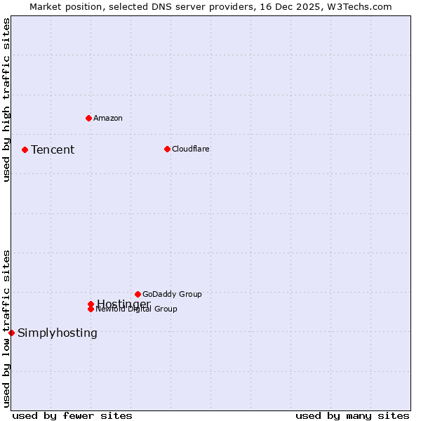 TechnologiesContent ManagementServer-side Languages Client-side Languages JavaScript Libraries CSS Frameworks Web Servers Web Panels Operating Systems Web Hosting Data Centers Reverse Proxies DNS Servers Email Servers SSL Certificate Authorities Content Delivery Traffic Analysis Tools Advertising Networks Tag Managers Social Widgets Site Elements Structured Data Markup Languages Character Encodings Image File Formats Top Level Domains Server Locations Content Languages | Technologies > DNS Servers > Technology usage comparison Comparison of the usage statistics of Hostinger vs. Tencent vs. Simplyhosting for websitesThis report shows the usage statistics of Hostinger vs. Tencent vs. Simplyhosting as DNS server provider on the web. See technologies overview for explanations on the methodologies used in the surveys. Our reports are updated daily. UsageThis diagram shows the percentages of websites using the selected technologies. How to read the diagram: