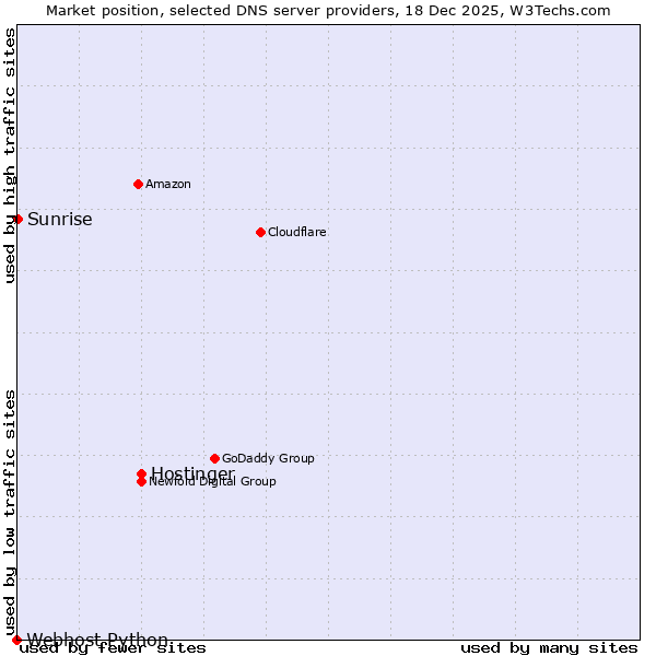 TechnologiesContent ManagementServer-side Languages Client-side Languages JavaScript Libraries CSS Frameworks Web Servers Web Panels Operating Systems Web Hosting Data Centers Reverse Proxies DNS Servers Email Servers SSL Certificate Authorities Content Delivery Traffic Analysis Tools Advertising Networks Tag Managers Social Widgets Site Elements Structured Data Markup Languages Character Encodings Image File Formats Top Level Domains Server Locations Content Languages | Technologies > DNS Servers > Technology usage comparison Comparison of the usage statistics of Hostinger vs. Sunrise vs. Webhost Python for websitesThis report shows the usage statistics of Hostinger vs. Sunrise vs. Webhost Python as DNS server provider on the web. See technologies overview for explanations on the methodologies used in the surveys. Our reports are updated daily. UsageThis diagram shows the percentages of websites using the selected technologies. How to read the diagram: