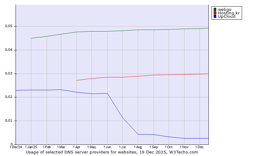 TechnologiesContent ManagementServer-side Languages Client-side Languages JavaScript Libraries CSS Frameworks Web Servers Web Panels Operating Systems Web Hosting Data Centers Reverse Proxies DNS Servers Email Servers SSL Certificate Authorities Content Delivery Traffic Analysis Tools Advertising Networks Tag Managers Social Widgets Site Elements Structured Data Markup Languages Character Encodings Image File Formats Top Level Domains Server Locations Content Languages | Technologies > DNS Servers > Technology usage comparison Comparison of the usage statistics of webgo vs. Hosting.kr vs. UpCloud for websitesThis report shows the usage statistics of webgo vs. Hosting.kr vs. UpCloud as DNS server provider on the web. See technologies overview for explanations on the methodologies used in the surveys. Our reports are updated daily. UsageThis diagram shows the percentages of websites using the selected technologies. How to read the diagram: