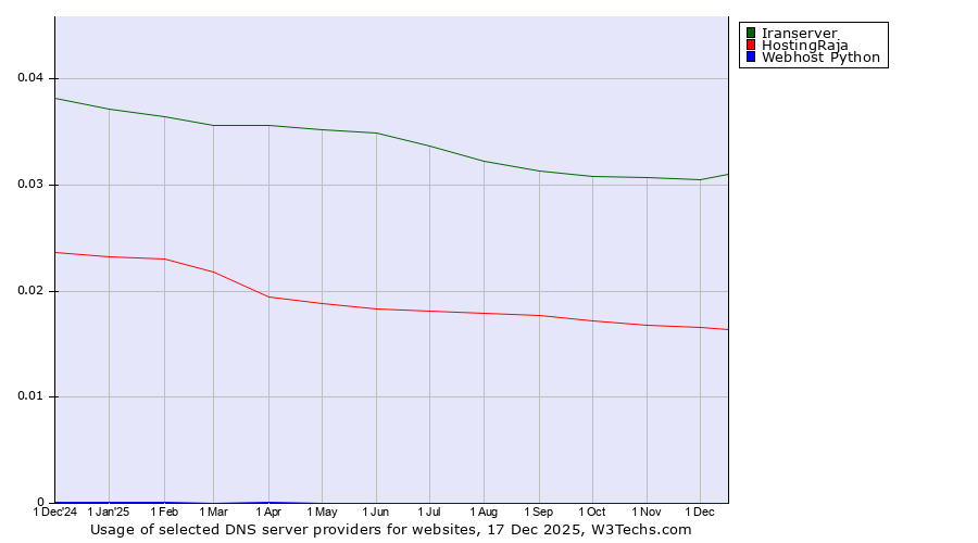 TechnologiesContent ManagementServer-side Languages Client-side Languages JavaScript Libraries CSS Frameworks Web Servers Web Panels Operating Systems Web Hosting Data Centers Reverse Proxies DNS Servers Email Servers SSL Certificate Authorities Content Delivery Traffic Analysis Tools Advertising Networks Tag Managers Social Widgets Site Elements Structured Data Markup Languages Character Encodings Image File Formats Top Level Domains Server Locations Content Languages | Technologies > DNS Servers > Technology usage comparison Comparison of the usage statistics of Iranserver vs. HostingRaja vs. Webhost Python for websitesThis report shows the usage statistics of Iranserver vs. HostingRaja vs. Webhost Python as DNS server provider on the web. See technologies overview for explanations on the methodologies used in the surveys. Our reports are updated daily. UsageThis diagram shows the percentages of websites using the selected technologies. How to read the diagram: