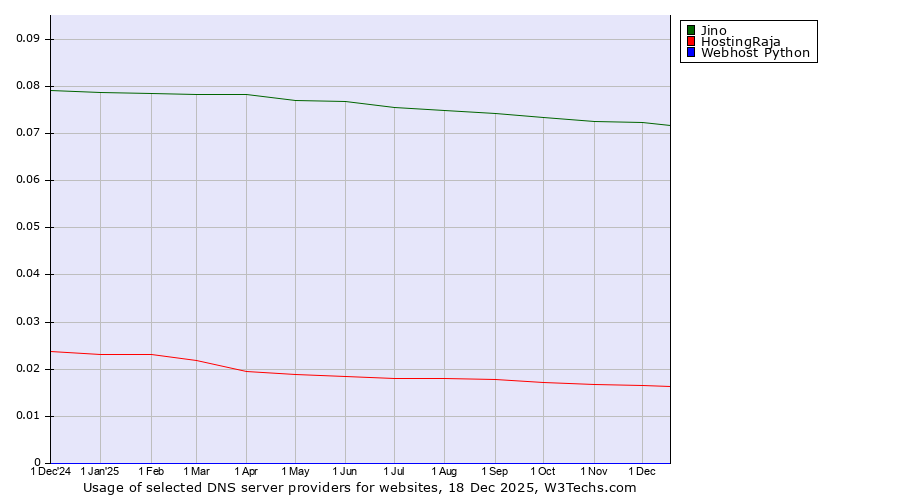 TechnologiesContent ManagementServer-side Languages Client-side Languages JavaScript Libraries CSS Frameworks Web Servers Web Panels Operating Systems Web Hosting Data Centers Reverse Proxies DNS Servers Email Servers SSL Certificate Authorities Content Delivery Traffic Analysis Tools Advertising Networks Tag Managers Social Widgets Site Elements Structured Data Markup Languages Character Encodings Image File Formats Top Level Domains Server Locations Content Languages | Technologies > DNS Servers > Technology usage comparison Comparison of the usage statistics of Jino vs. HostingRaja vs. Webhost Python for websitesThis report shows the usage statistics of Jino vs. HostingRaja vs. Webhost Python as DNS server provider on the web. See technologies overview for explanations on the methodologies used in the surveys. Our reports are updated daily. UsageThis diagram shows the percentages of websites using the selected technologies. How to read the diagram: