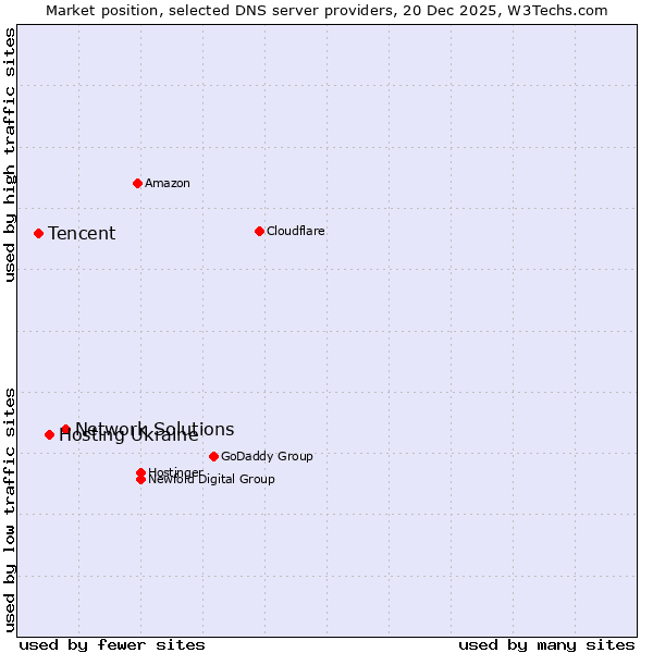 TechnologiesContent ManagementServer-side Languages Client-side Languages JavaScript Libraries CSS Frameworks Web Servers Web Panels Operating Systems Web Hosting Data Centers Reverse Proxies DNS Servers Email Servers SSL Certificate Authorities Content Delivery Traffic Analysis Tools Advertising Networks Tag Managers Social Widgets Site Elements Structured Data Markup Languages Character Encodings Image File Formats Top Level Domains Server Locations Content Languages | Technologies > DNS Servers > Technology usage comparison Comparison of the usage statistics of Network Solutions vs. Hosting Ukraine vs. Tencent for websitesThis report shows the usage statistics of Network Solutions vs. Hosting Ukraine vs. Tencent as DNS server provider on the web. See technologies overview for explanations on the methodologies used in the surveys. Our reports are updated daily. UsageThis diagram shows the percentages of websites using the selected technologies. How to read the diagram: