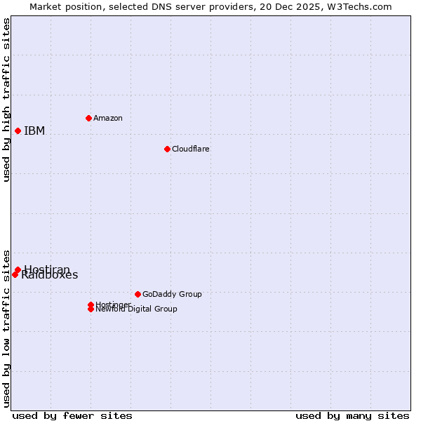 TechnologiesContent ManagementServer-side Languages Client-side Languages JavaScript Libraries CSS Frameworks Web Servers Web Panels Operating Systems Web Hosting Data Centers Reverse Proxies DNS Servers Email Servers SSL Certificate Authorities Content Delivery Traffic Analysis Tools Advertising Networks Tag Managers Social Widgets Site Elements Structured Data Markup Languages Character Encodings Image File Formats Top Level Domains Server Locations Content Languages | Technologies > DNS Servers > Technology usage comparison Comparison of the usage statistics of Hostiran vs. IBM vs. Raidboxes for websitesThis report shows the usage statistics of Hostiran vs. IBM vs. Raidboxes as DNS server provider on the web. See technologies overview for explanations on the methodologies used in the surveys. Our reports are updated daily. UsageThis diagram shows the percentages of websites using the selected technologies. How to read the diagram: