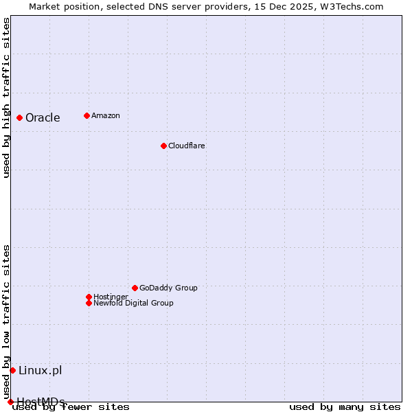TechnologiesContent ManagementServer-side Languages Client-side Languages JavaScript Libraries CSS Frameworks Web Servers Web Panels Operating Systems Web Hosting Data Centers Reverse Proxies DNS Servers Email Servers SSL Certificate Authorities Content Delivery Traffic Analysis Tools Advertising Networks Tag Managers Social Widgets Site Elements Structured Data Markup Languages Character Encodings Image File Formats Top Level Domains Server Locations Content Languages | Technologies > DNS Servers > Technology usage comparison Comparison of the usage statistics of Oracle vs. Linux.pl vs. HostMDs for websitesThis report shows the usage statistics of Oracle vs. Linux.pl vs. HostMDs as DNS server provider on the web. See technologies overview for explanations on the methodologies used in the surveys. Our reports are updated daily. UsageThis diagram shows the percentages of websites using the selected technologies. How to read the diagram: