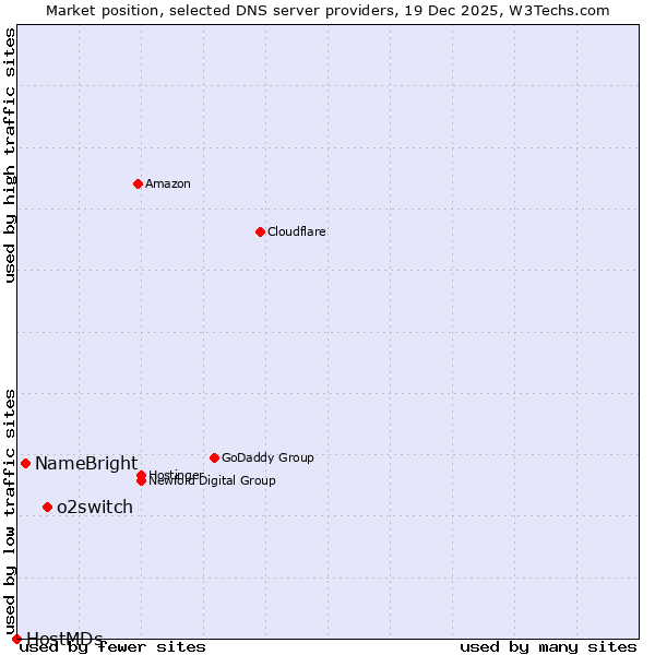 TechnologiesContent ManagementServer-side Languages Client-side Languages JavaScript Libraries CSS Frameworks Web Servers Web Panels Operating Systems Web Hosting Data Centers Reverse Proxies DNS Servers Email Servers SSL Certificate Authorities Content Delivery Traffic Analysis Tools Advertising Networks Tag Managers Social Widgets Site Elements Structured Data Markup Languages Character Encodings Image File Formats Top Level Domains Server Locations Content Languages | Technologies > DNS Servers > Technology usage comparison Comparison of the usage statistics of o2switch vs. NameBright vs. HostMDs for websitesThis report shows the usage statistics of o2switch vs. NameBright vs. HostMDs as DNS server provider on the web. See technologies overview for explanations on the methodologies used in the surveys. Our reports are updated daily. UsageThis diagram shows the percentages of websites using the selected technologies. How to read the diagram: