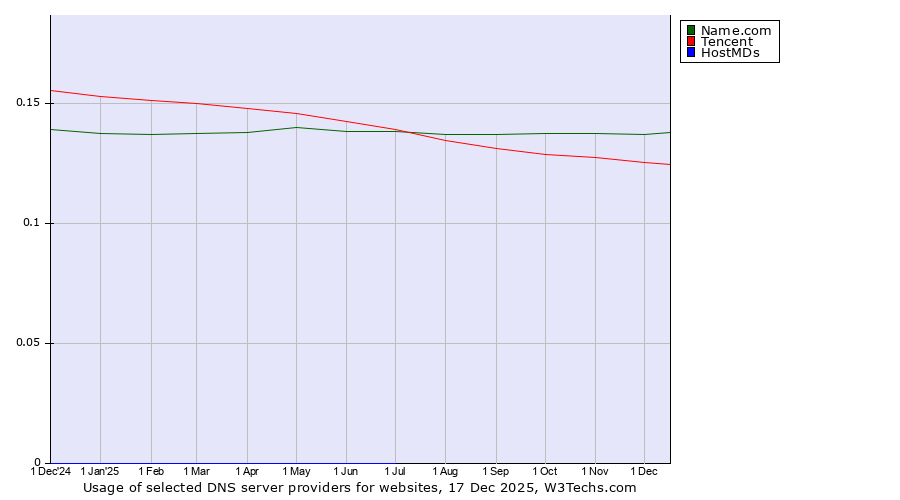 TechnologiesContent ManagementServer-side Languages Client-side Languages JavaScript Libraries CSS Frameworks Web Servers Web Panels Operating Systems Web Hosting Data Centers Reverse Proxies DNS Servers Email Servers SSL Certificate Authorities Content Delivery Traffic Analysis Tools Advertising Networks Tag Managers Social Widgets Site Elements Structured Data Markup Languages Character Encodings Image File Formats Top Level Domains Server Locations Content Languages | Technologies > DNS Servers > Technology usage comparison Comparison of the usage statistics of Name.com vs. Tencent vs. HostMDs for websitesThis report shows the usage statistics of Name.com vs. Tencent vs. HostMDs as DNS server provider on the web. See technologies overview for explanations on the methodologies used in the surveys. Our reports are updated daily. UsageThis diagram shows the percentages of websites using the selected technologies. How to read the diagram: