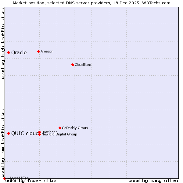 TechnologiesContent ManagementServer-side Languages Client-side Languages JavaScript Libraries CSS Frameworks Web Servers Web Panels Operating Systems Web Hosting Data Centers Reverse Proxies DNS Servers Email Servers SSL Certificate Authorities Content Delivery Traffic Analysis Tools Advertising Networks Tag Managers Social Widgets Site Elements Structured Data Markup Languages Character Encodings Image File Formats Top Level Domains Server Locations Content Languages | Technologies > DNS Servers > Technology usage comparison Comparison of the usage statistics of QUIC.cloud vs. Oracle vs. HostMDs for websitesThis report shows the usage statistics of QUIC.cloud vs. Oracle vs. HostMDs as DNS server provider on the web. See technologies overview for explanations on the methodologies used in the surveys. Our reports are updated daily. UsageThis diagram shows the percentages of websites using the selected technologies. How to read the diagram: