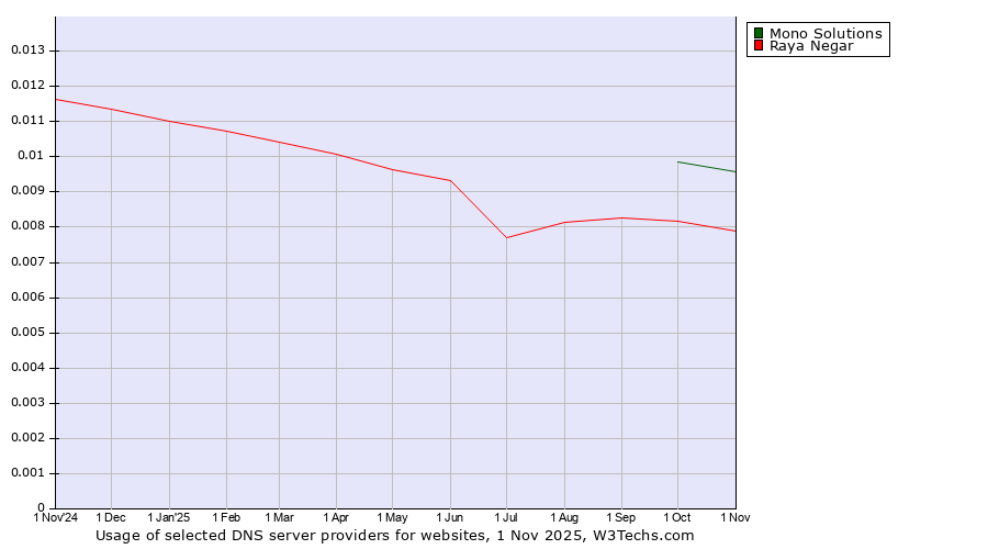 TechnologiesContent ManagementServer-side Languages Client-side Languages JavaScript Libraries CSS Frameworks Web Servers Web Panels Operating Systems Web Hosting Data Centers Reverse Proxies DNS Servers Email Servers SSL Certificate Authorities Content Delivery Traffic Analysis Tools Advertising Networks Tag Managers Social Widgets Site Elements Structured Data Markup Languages Character Encodings Image File Formats Top Level Domains Server Locations Content Languages ComparisonCompare with other | Technologies > DNS Servers > Technology usage comparison Comparison of the usage statistics of Mono Solutions vs. Raya Negar for websitesThis report shows the usage statistics of Mono Solutions vs. Raya Negar as DNS server provider on the web. See technologies overview for explanations on the methodologies used in the surveys. Our reports are updated daily. UsageThis diagram shows the percentages of websites using the selected technologies. How to read the diagram: